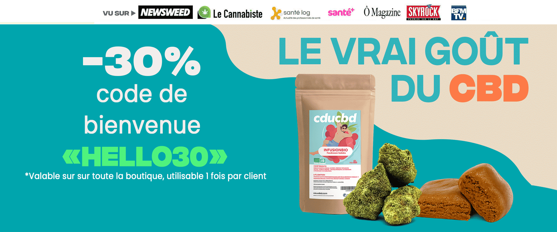 Découvrez notre large gamme pour votre consommation alimentaire de CBD: Fleurs CBD, huiles, infusions, résines, et plus encore. Livraison gratuite sur tout le CBD Shop dès 50 € d’achat (France, Monaco, Andorre) et des cadeaux dans chaque commande.