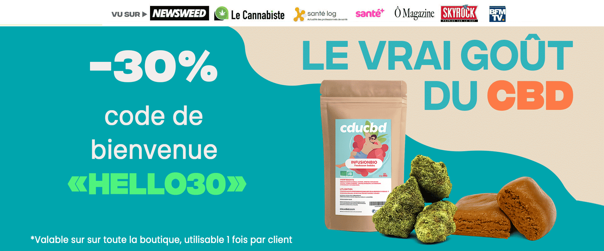 Découvrez notre large gamme pour votre consommation alimentaire de CBD: Fleurs CBD, huiles, infusions, résines, et plus encore. Livraison gratuite sur tout le CBD Shop dès 50 € d’achat (France, Monaco, Andorre) et des cadeaux dans chaque commande.