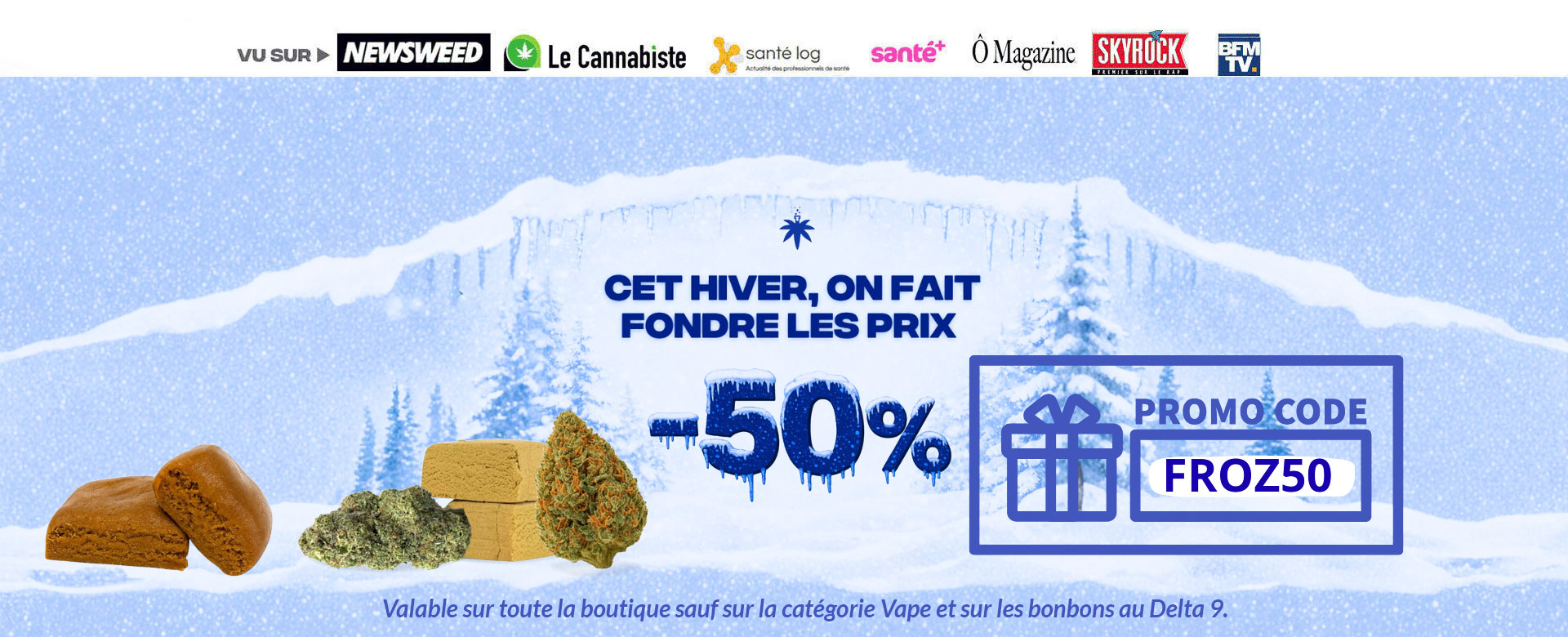 Découvrez notre large gamme pour votre consommation alimentaire de CBD: Fleurs CBD, huiles, infusions, résines, et plus encore. Livraison gratuite sur tout le CBD Shop dès 50 € d’achat (France, Monaco, Andorre) et des cadeaux dans chaque commande.