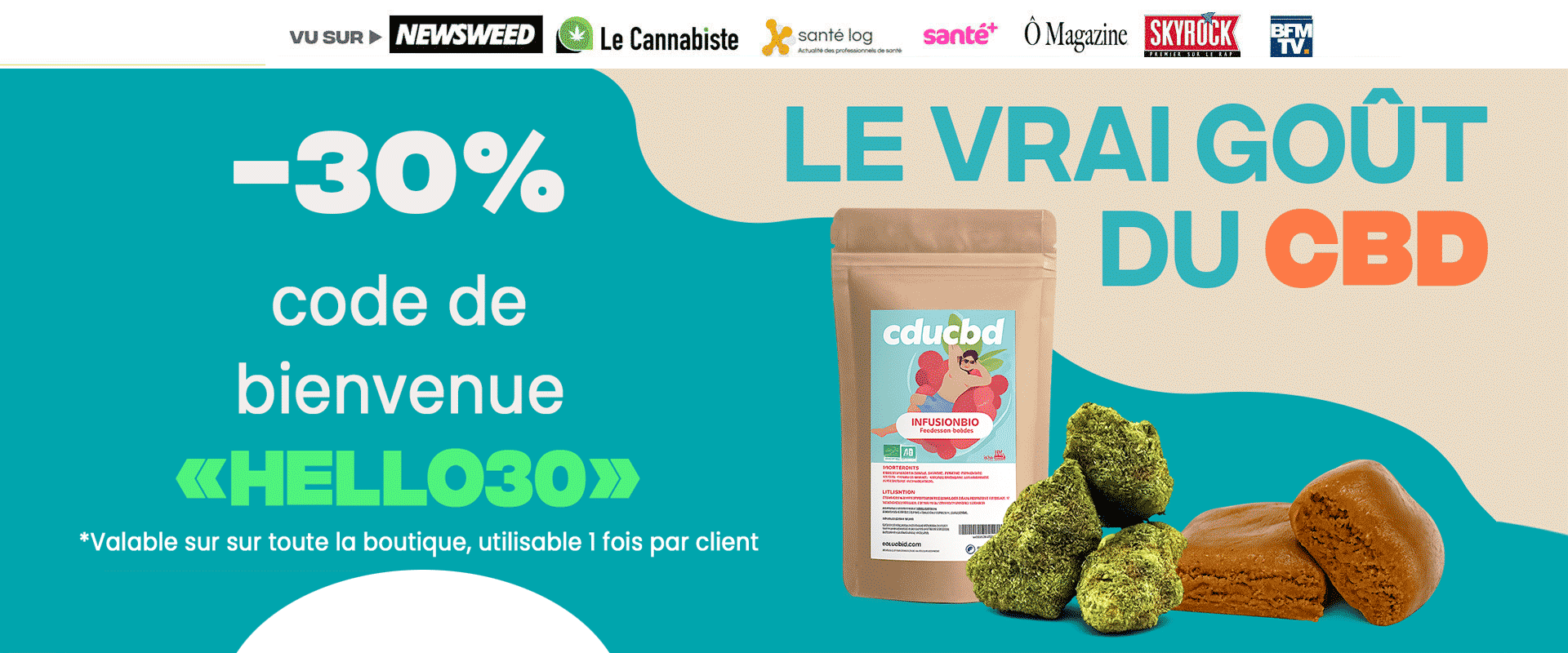 Découvrez notre large gamme pour votre consommation alimentaire de CBD: Fleurs CBD, huiles, infusions, résines, et plus encore. Livraison gratuite sur tout le CBD Shop dès 50 € d’achat (France, Monaco, Andorre) et des cadeaux dans chaque commande.